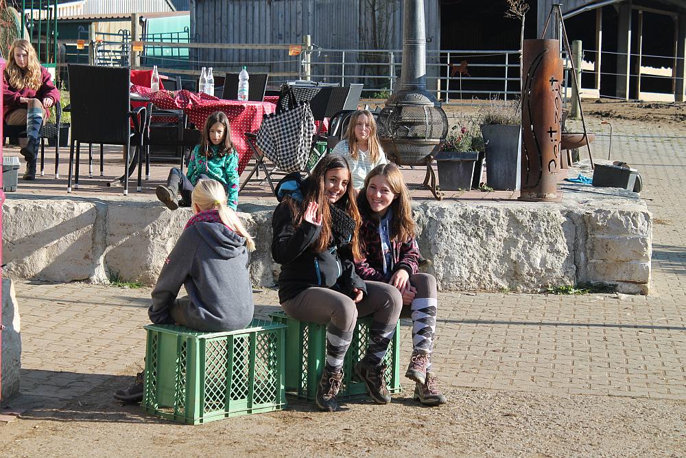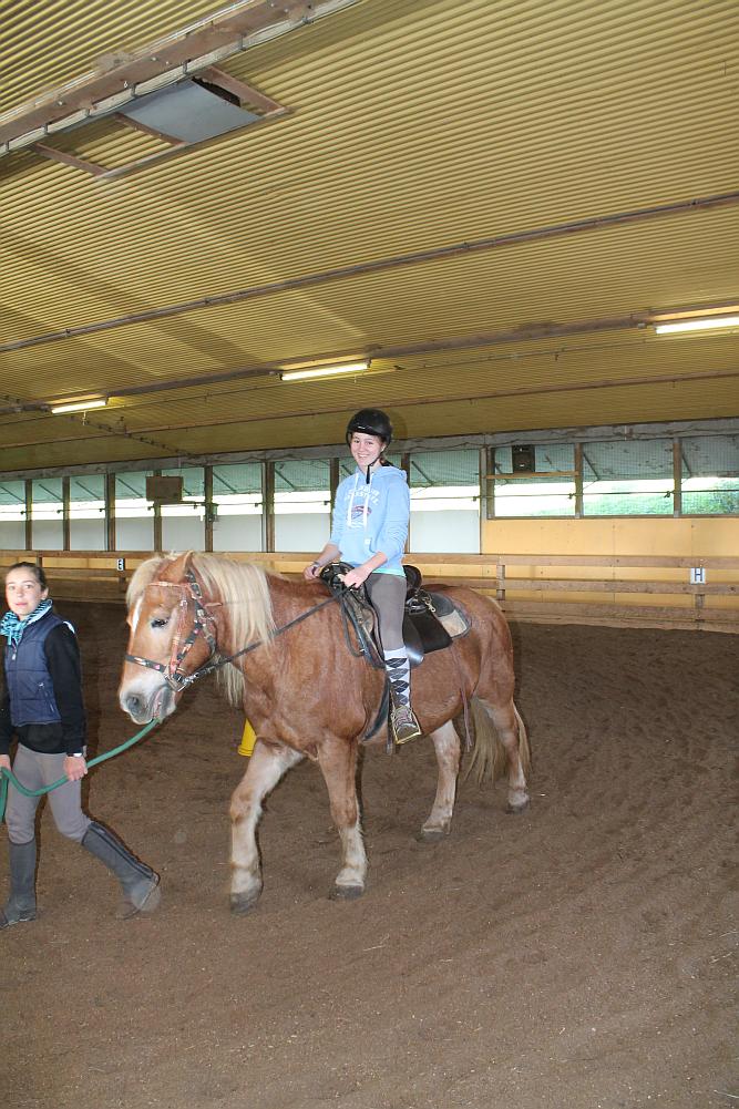 Montag, 28. Oktober 2013: Seit heute sind sie da, die Kids vom Herbst 2013! Unerschrocken, wetterfest und fröhlich starteten die Reiterferien bei strahlendem Sonnenschein. Da wurde einem schonmal richtig warm und das Ende Oktober! Eigentlich hatten wir uns ja auch gewünscht, dass es die ganze Woche so weitergeht, aber das muss Petrus irgenwie mißverstanden haben….. Naja, egal! Wir reiten trotzdem! Herute gab es erstmal die übliche Vorstellungs-, Pferde- und Zimmerverteilungsrunde mit anschließendem Bettenbeziehen und MIttagessen und nach einer kurzen Mittagspause in der Sonne startete eeendlich das Pferdeprogramm! In 4 Gruppen wurde heute Nachmittag vorgeritten und die Reitlehrer guckten, ob die Zwei- und Vierbeinerpaare zusammen passen. Die Gruppen, die gerade nicht mit Reiten dran waren, durften schonmal misten, Gymnastik machen vor dem Reiten und auf dem Holzpferd den Entlastungssitz üben. Da wurde natürlich viel gekichert, obwohl es doch gut aussah…. 😉 Gegen Abend kam dann der Herbst zurück mit ordentlich viel Wind und Regen. Das war aber nicht wirklich schlimm, denn die Hofrallye findet ja quasi in der Sattelallee statt – also im Trockenen! Um 21 Uhr waren schon alle in die Zimmer verschwunden und draußen hörte man nicht mehr viel von der ganzen Bande…….