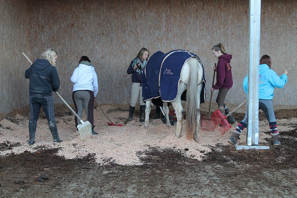 Freitag, 1. November 2013: Der letzte Tag ist da und mit ihm kommt das schlechte Wetter! Es ist frisch und nebelig und richtig ungemütlich! Also da hätte uns Petrus doch nochmal Sonne schicken können! Naja, der Laune tats keinen großen Abbruch und so gings mal wieder rund. Koffer runterbringen, Zimmer fegen, Müll runter, dann misten und fegen in der Sattelallee. Dabei halfen die Prüflinge, denn zuerst kamen die „Großen“ von Junior III dran mit ihrer schriftlichen Prüfung. Anschließend ging es weiter mit Junior I und II. Die wurden nur mündlich gefragt und die ersten durften in die Halle zur Reitprüfung. Es klappte alles wie am Schnürchen, auch bei den „Kleinen“ und so ging es gutgelaunt zum MIttagessen. Die Nicht-Prüflinge absolvierten unterdessen einen Beautycontest und schmückten ihre Pferde. Nach dem Essen starte der lange Ausritt und auch der Führausritt ging los. Bei den Junioranwärterinnen ging es weiter mit dem Reiten und die IIIer mussten ja auch ihr Können noch im Gelände beim Ausritt beweisen. Schon waren die anderen wieder da und die ersten Eltern kamen. Als alle wieder da waren musste die VFD Prüferin noch alles auswerten und ausfüllen und endlich stand fest: alle 16 Kids haben bestanden! Herzlichen Glückwunsch, ihr Fleissigen! Bleibt zu sagen, dass die Jüngste der neuen Juniorinnen erst 7 Jahre alt ist, die älteste 15 Jahre. Die Prüferin war sehr angetan und war hochzufrieden! Sogar die Kleinen hätten vielmehr gewusst, als sie eigentlich hätten wissen müssen! Noch schnell ein Gruppenbild mit allen und das Kuchenbuffet wurde gestürmt. Nach und nach wurde es leer und vor allem dunkel und die Herbstreiterferien 2013 sind vorbei! Ihr wart eine sehr ruhige, harmonische und nette Truppe Mädels! Kommt mal wieder!