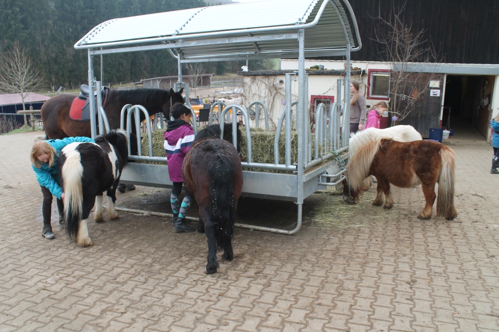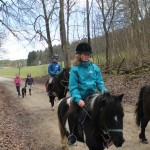 Freitag, 1. April 2016: Und schon ist er wieder da, der letzte Tag….. Schon am frühen morgen sah man traurige Gesichter, die man dringend trösten musste. Und wir sehen uns ja wieder….. Auch der Himmel war traurig, denn er liess sich erst garnicht blicken. Wir waren quasi im Nebel versunken und das nach dem tollen Tag gestern. Naja, irgendwann wurde es ein wenig besser und Hauptsache, es regnete nicht den ganzen Tag. Heute war ja Wunschprogrammtag, d.h. alle Kids durften sich 2 Sachen aussuchen, die sie mit oder auf den Pferden probieren wollten und so sah man schnell die ersten ohne Sattel reiten, in der Halle machten sogar die ganz Kleinen schon Bodenarbeit mit ihren Ponys und auch ein kleiner und der ganz große Ausritt starteten. Nach dem Mittagessen ging es weiter und es kamen noch turnen auf dem Pferd und unser allseits beliebter Beautycontest dazu. Irgendwo zwischen leckeren Gemüseburgern, sauren Schlangen und dem großen Hof kam uns die Zeit abhanden und so dauerte es es eeeeetwas länger als sonst, bis auch die Letzten Pferde im satt, zufrieden und wieder im Stall waren. Die Elterntaxis kamen und ruckzuck hatten wir ein Megakuchenbuffet aufgebaut. Das war auch nötig, denn schon kurz nach dem Mittagessen fragten die ersten, was es denn heute zum Nachtisch gibt. Also gabs auch kein Halten mehr, nachdem alle Gewinner der Woche geehrt und die Erinnerungsfotos mit den Pferden verteilt waren: 44 Kids stürmten ins Reiterstüble zum Kuchen futtern ……… 😉 Nach und nach verabschiedeten sich alle und bei einigen hieß es: bis in 6 Wochen…. Jaaa, da fangen die Pfingstreiterferien an! In Woche 2 (23.-27.5.) gibt es da noch freie Plätze, also ran an die Anmeldungen, Mädels!