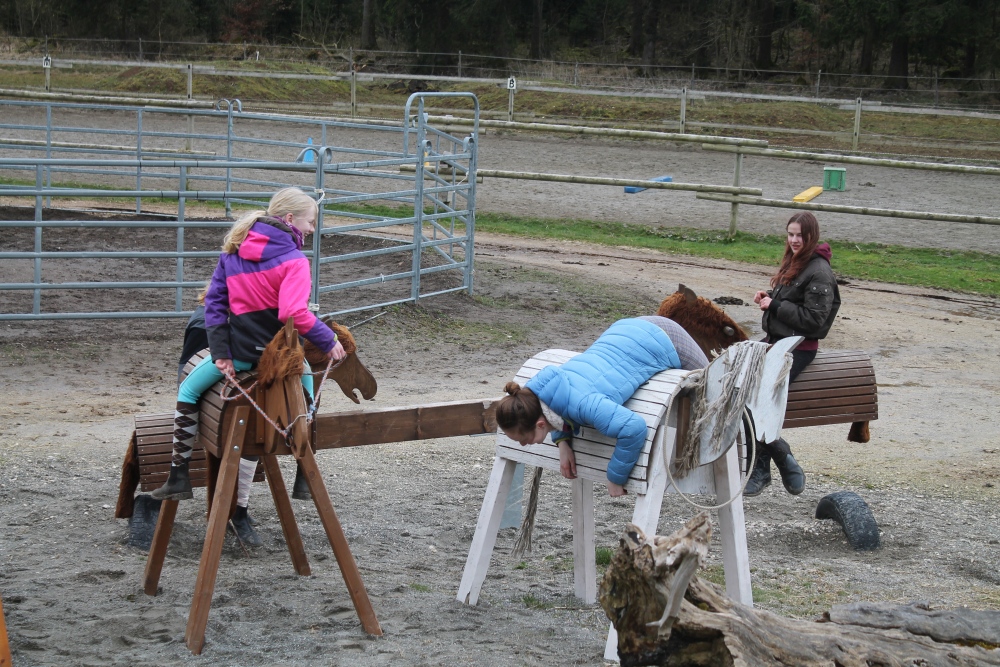 Mittwoch, 30. März 2016: Und schon ist wieder Bergfest, wie immer geht das viel zu schnell. Und vom Wetter konnte man heute nur denken, dass es wohl ein Aprilscherz sein soll: wir hatten quasi 1x pro Stunde Sonne, 1x Wind, 1x Regen und 1x nur trocken und das ging den ganzen Tag so. Aber wir sind ja flexibel und mit einer ordentlichen Portion Punsch im Bauch ging alles besser. Außer viel Reiten gab es heute noch jede Menge Pferde zu putzen und auch das Sattelzeug kam an die Reihe. Da blitzte nachher alles. Ein paar ganz Eifrige hatten sich vorgenommen, den Hof blitzblank zu fegen – großes Lob! Auch Misten stand wie immer auf dem Plan und gegen Abend mussten noch die Stöcke fürs Stockbrot gesammelt und zurecht geschnitzt werden, schließlich gibts heut abend Lagerfeuer. Wir sind schon seit gestern in der Phase: es wird viel gefuttert und obwohl es heute Kartoffeln mit Spinat und Rührei gab kamen die Kids doch alle mehrmals zum Nachschlag holen. Das wiederholte sich in noch größrem Ausmaß beim nachtisch: leckerem Brownie-Schokokuchen, der noch warm aus dem Ofen auf die Teller kam. Also heute kann eigentlich keiner mehr Hunger haben….. 😉 Heute Abend haben sich die Kids nach dem Lagerfeuer und dem Grillen noch Action in der Reithalle gewünscht. Das Schubkarrenrennen gestern kam so gut an, dass sie heut weiterrennen wollen…..