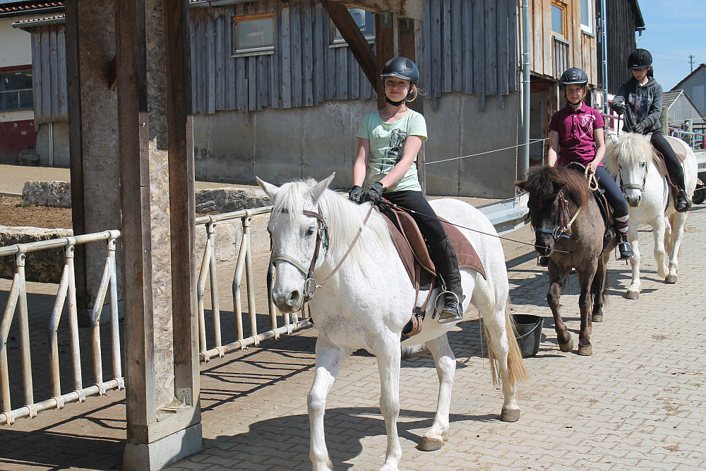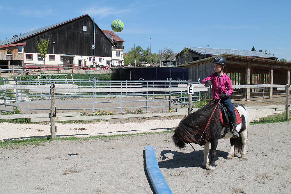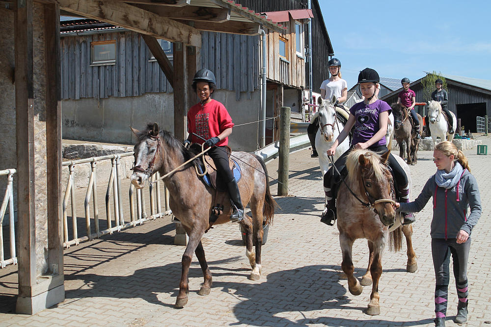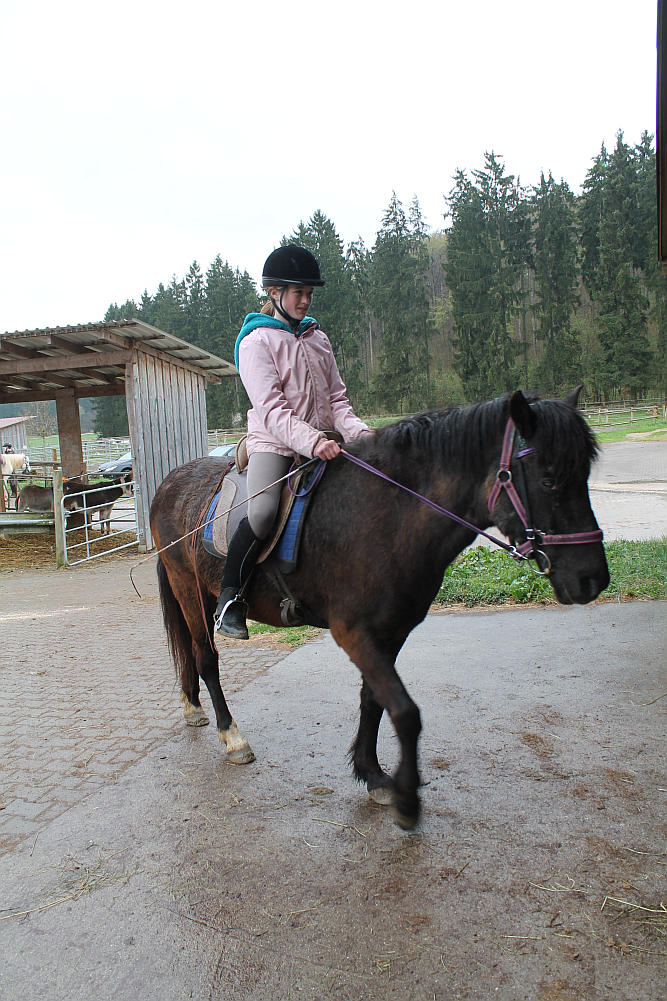 Dienstag, 22. April 2014: Die Sonne lacht, die Kids auch, so solls sein! Auch wenn es immer mal wieder ein Wölkchen am Himmel und ein paar Tropfen Regen gab war es doch insgesamt heut sonnig und stellenweise richtig warm. Der Tag startete mit Pferde füttern und frühstücken, bevor um 9 UHr die Tageskinder kamen und das Reitprogramm losging. Halle und Platz waren belegt und die ersten Kids ritten aus. Die restlichen halfen beim Führen und abwechselnd dann auch beim Misten, sodass alle bis zum Mittagessen ordentlich Hunger hatten! Nach dem Essen durfte unsere frischgebackene Pferdemama Canella mit ihrem hübschen Nachwuchs einen kleinen Ausflug in die große Welt machen: die Kleine Maus ist sowas von schnell! Anschließend wurde – na klar – der „Kiosk“ gestürmt und der Vorrat für heute Abend eingekauft. Nach der Pause wurde wieder geritten und zwischendrin gefegt, Knoten geübt und Nachtisch gegessen. Der Aufforderung zum Duschen vor dem Abendessen kamen auch tatsächlich ein paar nach und was es als Abendprogramm heute gibt, das entscheidet sich nach dem „noch Können) der Teilnehmerinnen….. 😉