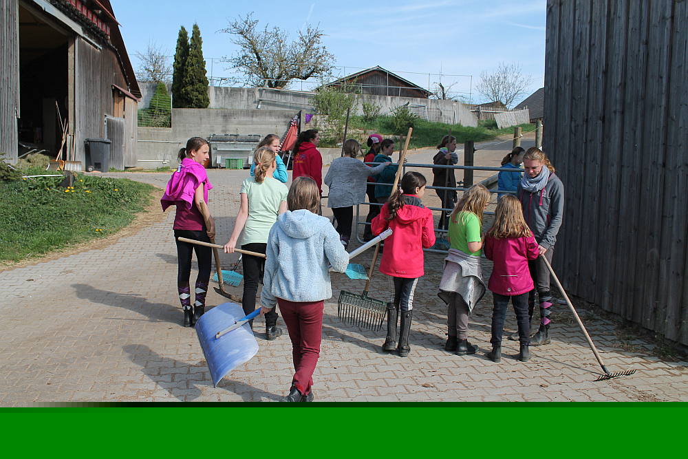 Freitag, 25. April 2014: Da isser, der letzte Tag! Und die Sonne meinte es auch heute wieder gut mit uns! Na wenigstens…… Als erste Tat nach dem Frühstück wurden heute die gepackten Koffer runtergeschafft und die Zimmer gefegt. Auch der Müll sollte in die dafür vorgesehenen Behälter bugsiert werden, was sich aber als ganz aaarg schwierig erwies! 2 Mädelsn bekamen einen Sonderpreis, weil ihre Besen auch UNTERM Bett ihre Arbeit machten! Anschließend startete der Wunschtag: Trailparcour auf dem Reitplatz, Reiten ohne Sattel und Longer in der Halle und der erste kleine Ausritt startete. Mittagessen, Mittagspause, Laden stürmen und schon Teil 2 und 3 – die letzten „Aktivitäten mit Pferd“ begannen. Die „Zwergenbude“ musste auch noch aufgeräumt und der Hof gefegt werden samt Bollen einsammeln und der Abschied nahte. Irgendiwe musste es doch jede Menge Fahrgemeinschaften gegeben haben denn wenige Eltern holten viele Kids ab! 😉 Nach der offiziellen Verabschiedung wurden die Eltern von den Kids noch fachkundig über den Hof geführt und nach und nach verabschiedeten sich alle. Das Erstaunlichste des Tages: es blieb nur eine Jacke und eine Weste liegen…….