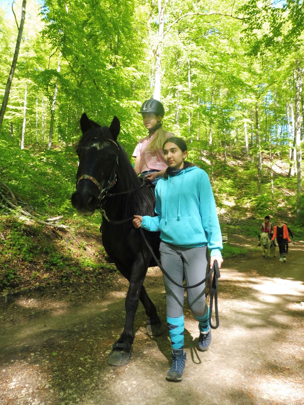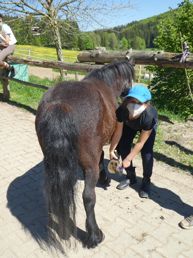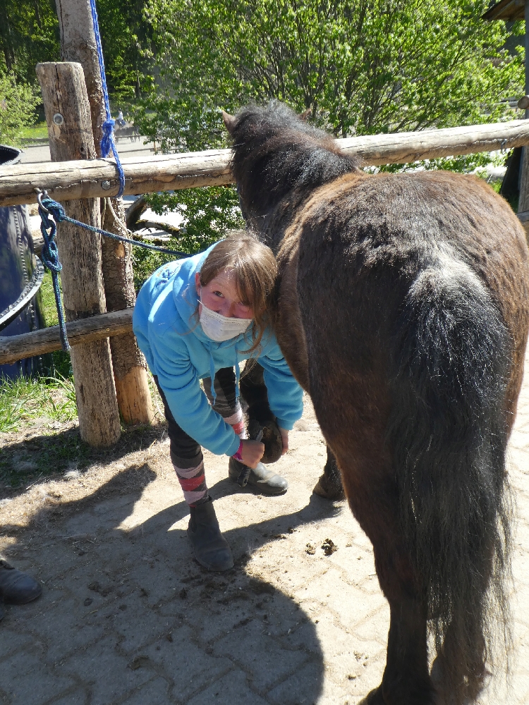 Freitag, 4. Juni 2021: Und schwupps ist die Woche rum! Einige der Kids fanden es schon beim Aussteigen aus dem Auto schade… Zuerst lag aber mal noch ein voller Tag vor uns und zum warm werden wurde eine Runde gemistet. Das ging sehr schnell, wie jedes Mal diese Woche und danach musste erst eine Snackpause her! 😉 Dann ran an das Wunschprogramm: reiten ohne Sattel, Horse Agility, Beautycontest, ausreiten – jeder konnte sich 2 Sachen aussuchen, die er immer schonmal machen wollte. Das MIttagessen – heute gab es selbstgemachte Pizza – wurde sehnsüchtig erwartet und auch im Laden kamen die meisten noch vorbei. Am Nachmittag, nach dem ersten Durchgang und der Nachtischpause, sollte gerade die letzte Runde starten, als ein heftiges Gewitter kam. Ausritt abgesagt, Alternativprogramm überlegt und dann krachte ein wirklich lauter Donner runter, der alle, groß und klein, zwei- und vierbeinig, sich erschrecken ließ! Es folgte ein Regenguss samt Hagel und am Ende dampfte die Straße! Trotzdem kamen die Kids noch zum Pferd und schon wurde es Zeit zum Abschied nehmen. Viele der Mädels sehrn wir ja schon bald wieder und dann hoffentlich mit Übernachtung – die Zahlen sind ja mal sehr positiv…. Es war eine schöne Woche mit Euch!