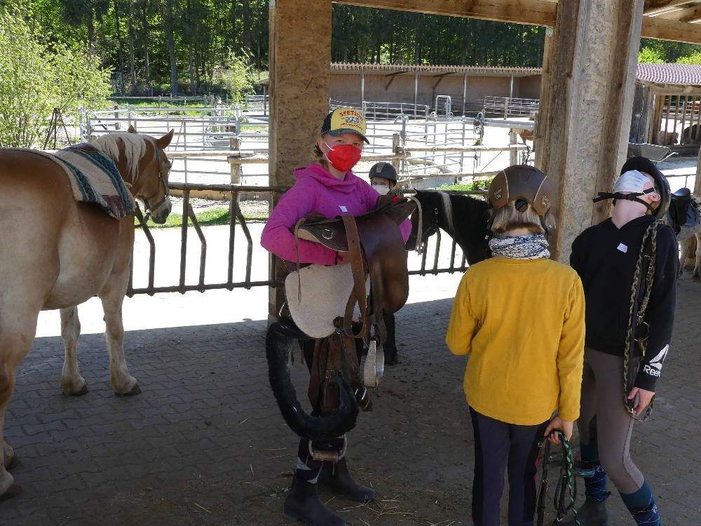 Montag, 31. Mai 2021: … und weiter geht’s mit Pfingsten 2! Kaum zu glauben, aber die Sonne schien, als kriegte sie es bezahlt! 😉 T-Shirtwetter….. Dementsprechend gut war die Laune der Kids, wobei doch viele Wiederholungstäterinnen dabei sind, die sich auskennen. Die nehmen die Neuen dann gleich mit! Der Tag startete mit einer Mistaktion, bis alle angekommen waren und dann ging es los mit Vorstellungsrunde, Pferdeeinteilung usw. Irgendwie ging heute alles flott und so konnten wir punkt 12 Uhr Mittagessen. Anschließend wurde gleich der Laden gestürmt und dann nix wie ran an die Pferde! Nacheinander kamen alle in kleinen Gruppen zur Probereitstunde und jetzt „brüten“ die Betreuerinnen über der Kleingruppeneinteilung für Morgen. Zwischendrin gab es noch Nachtischpause mit lecker Joghurt und ich glaube, die Brote werden zum Abendessen auch weg gehen…..