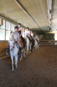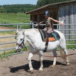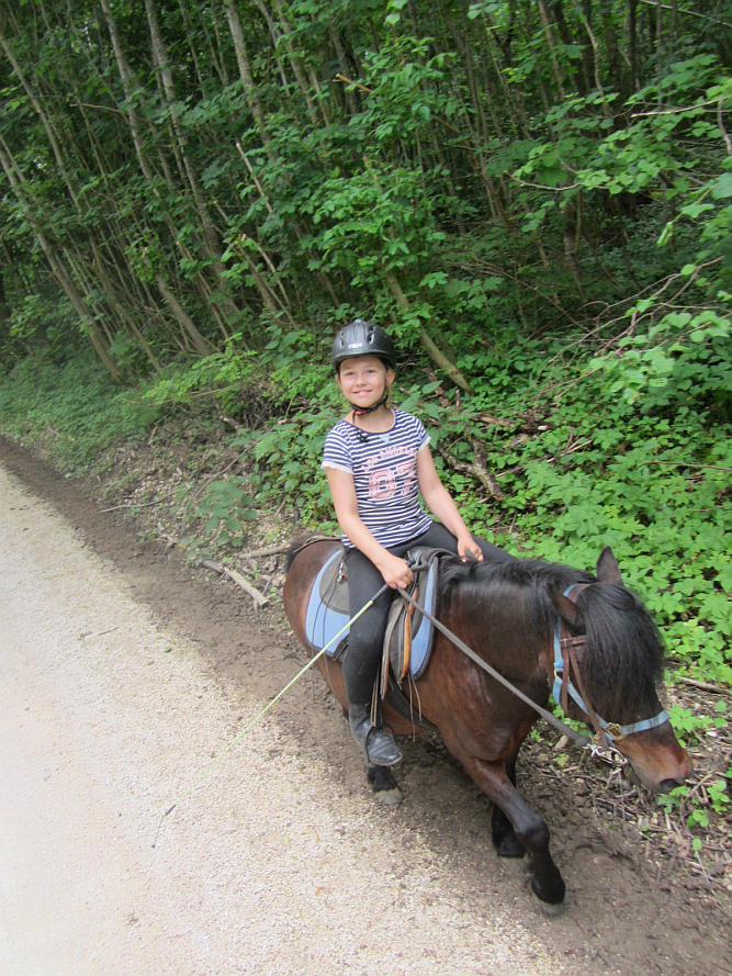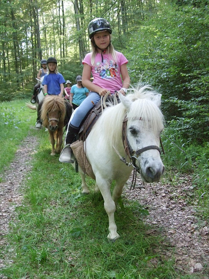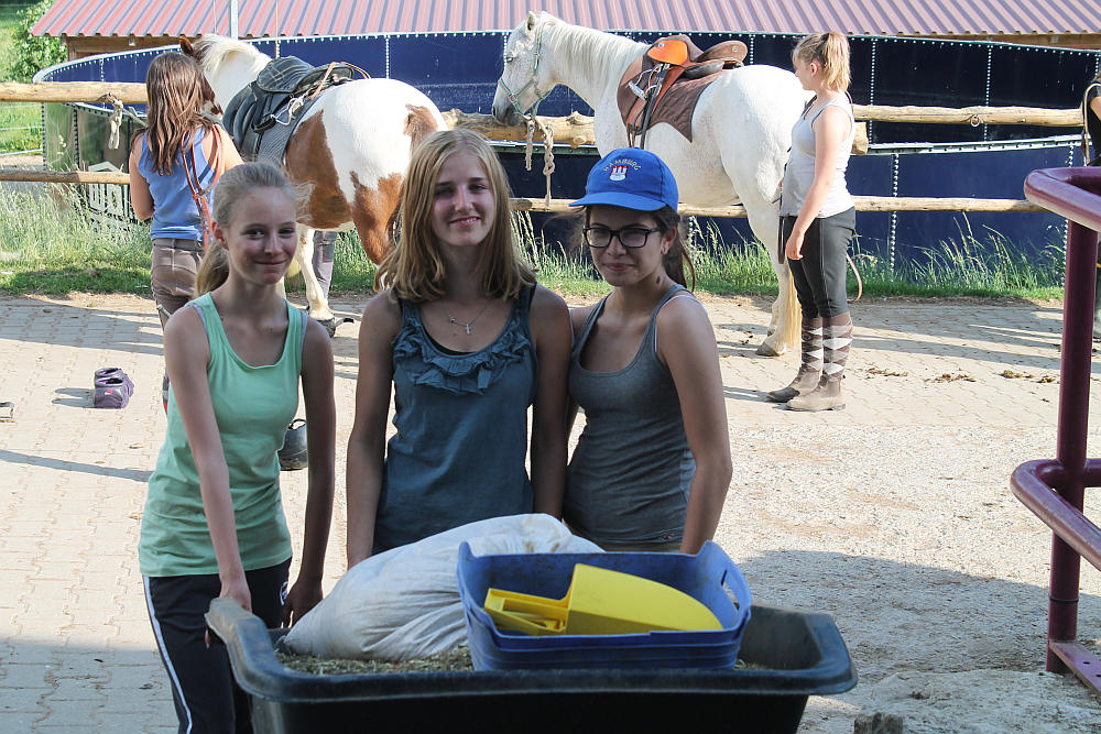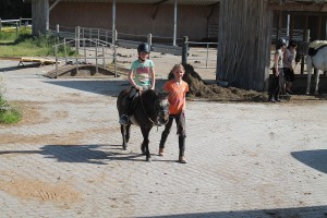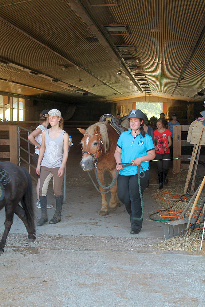 Montag, 9. Juni 2014: Es ist wieder soweit – die Kids kommen (oder besser gesagt, die Kinder und Jugendlichen… ;-))! Bei tropischen Temperaturen nebst dazugehörigem Sonnenschein reisten alle an. Erwartungsvoll die „Neulinge“, cool und kichernd die „WiederholungstäterInnen“ und auch 2 Jungs kamen dazu. Nach Hofrundgang, Elternverabschiedung und Vorstellungsrunde wurden die Pferde und die Zimmer eingeteilt und das Kofferchaos löste sich auf. Mittagessen, Mittagspause, Laden stürmen und – endlich zu den Pferden! In Gruppen holten alle ihre Pferde aus dem Stall, suchten sich ein schattiges Plätzchen, putzten und sattelten ihre Vierbeiner und los gings in die Halle zur Probereitstunde. Lenken, Richtungswechsel, Traben und bei manchen auch schon galoppieren standen auf dem Plan und wer gerade nicht beim Reiten war, der übte am Holzpferd den Entlastungssitz, half beim Führen oder machte Nachtischpause im Schatten. Einige halfen auch bei der täglichen Globulirunde für die Pferde, erst richten, dann verteilen und flugs war der Nachmittag schon rum! Nach dem Abendessen gibts noch die Hofrallye und ich denke mal, es werden heut schon alle müde in die Betten fallen!