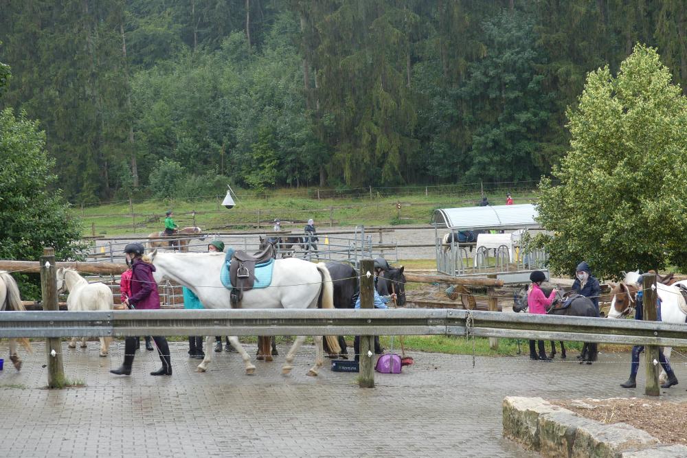 Montag, 3. August 2020: Es ist soweit, endlich dürfen wir wieder in die Reiterferien starten und das MIT Übernachtung! Wir freuen uns sehr und wenn man die Eltern so hört, dann freuen sich die Kids auch…. 😉 Was man natürlich sagen muss: die Orga ist schon heftig und bis heute alle wussten, wie was abläuft, dauerte es schon etwas. Aber alle kamen zum Reiten, bekamen ein Bett, wissen jetzt, wann der Duschplan sagt es wäre mal Zeit für Wasser und dank der Erfindung von Armbändchen können wir unsere 3 Gruppen doch ganz gut unterscheiden. Nachdem alle da waren wurden zuerst die Reitkenntnisse abgefragt, Vorstellungsrunde, Hof angucken usw. wurden dann in den 3 Gruppen erledigt, bevor es Mittagessen gab. Man muss schon sagen, die Kids hatten Hunger! Nach dem Essen wurden die Zimmer bezogen, es gab einen Kurzbesuch im Laden und ran gings an die Pferde. Leider wollte der Regen auch mitspielen und es schüttete doch eine ganze Weile wie aus Eimern. Naja, es soll sich bessern und auch wieder wärmer werden – wir hoffen das Beste! Außerdem machte es das Fotografieren doch recht schwer weil zu naß und zu dunkel, aber auch das wird sich bessern! Nach dem Abendessen war Duschzeit für die Einen und der Rest traf sich in der Halle zum Abendprogramm. Heute stand ein Tanzwettbewerb auf dem Plan und die Bande hatte glaube ich viel Spaß! Jetzt sind alle in ihren Zimmern und über mir im Hühnerstall ist es schon gaaanz still….