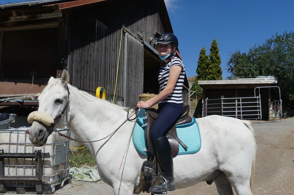 Dienstag, 4. August 2020: Eins muss man dem Team lassen, von Corona – Chaos war heute nichts mehr zu spüren. Nur das Wetter scheint noch nicht ganz eingespielt zu sein. Nach einer kurzen Erinnerung an die Corona – Regeln konnte es losgehen. Heute wurden die ersten Ausritte gemacht und auf dem Reitplatz und in der Halle wurde fleissig geübt. Sitzschulungen und Vertrauensübungen waren inklusive. Da wurde freihändig und mit geschlossenen Augen geritten, lenken geübt und der leichte Sitz perfektioniert.