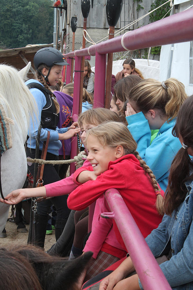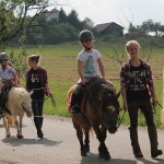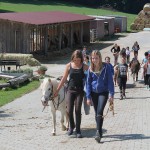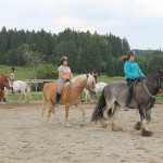 Montag, 17. August 2015: Tadaaaa, die Kids von Sommer 3 sind daaaa! Viele viele bekannte Gesichter, seeehr viel größer gewordene Teenies (ich weiß, ich krieg keinen Bonus, weil ich so klein bin ;-)) und alle sind gespannt, welche Pferde sie bekommen und wer mit wem in ein Zimmer kommt. Die Verteilung ging recht flott und so gabs pünktlich Mittagessen. Auch der Laden konnte noch schnell gestürmt werden, bevor es an die Pferd ging. Nach und nach kamen alle dran mit Vorreiten und auch das Holzpferd wurde von allen besucht. Nach der Nachtischpause ging es weiter und schnell war der Nachmittag rum. Die dieses Mal vielen Tageskids wurden abgeholt und die „Übernachterinnen“ halfen noch beim Füttern, bevor es für sie ans Abendessen ging. Als Abendprogramm wird nachher noch der Hof per Hofrallye erkundet und weil so viele „Wiederholungstäterinnen“ dabei sind, müssen wir uns immer neue und schwierigere Fragen ausdenken…..
