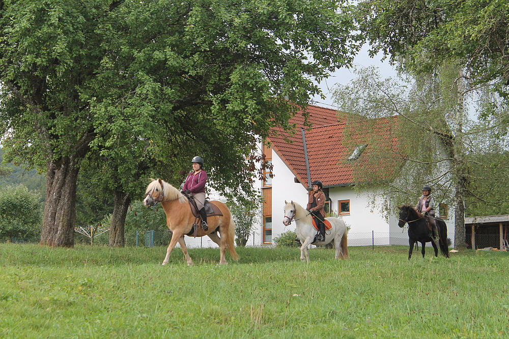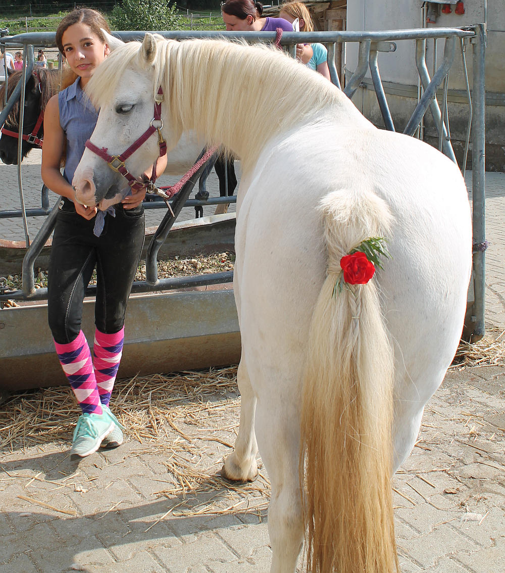 Freitag, 21. August 2015: *Heul* der letzte Tag ist da….. Aaaber wir sehen ja doch einige schon bald wieder! Gestern Abend wurde erst noch der Holzpferdeherdenbeitrag von Sommer 3 vollendet und man hatte so manchmal den Eindruck, als wenn die Farbe nicht nur auf dem Holz gelandet wäre….. Sind echte Kunstwerke dabei rausgekommen und die werden schnellstmöglich zu den anderen auf die Koppel gelassen! 😉 Heute morgen dann KOffer packen, Zimmer entrümpeln und entmüllen und gemeinsames Misten. Wobei die ganze Bande so flott war, dass sie eher fertig waren als wir mit dem Putzen! Tja, Rekordverdächtig……. Dann aber gings endlich los: die verschiedenen Aktivitäten auf und mit den Pferden starteten. Ganz hoch im Kurs waren heute reiten ohne Sattel und kleiner Ausritt, sowie der Beautycontest. Auch einen langen Ausritt gab es und ein paar Kids turnten auf dem Pferd. Zwischendrin musste noch die Zwergenbude geräumt werden, die Großen halfen wieder bei den Globuli (sind schon echte Expertinnen!) und zwischendrin gab es ja auch noch Mittagessen – leckere Münsinger zum selber basteln. Ich sage nur: leere Schüsseln und Töpfe…… Schon waren die ersten Eltern da und mussten sich natürlich die Pferde anschauen. Die Wochengewinner wurden geehrt und die Fotos verteilt und eeeeendlich ging es ans Kuchenbuffet – herzlichen Dank nochmal dafür, liebe Eltern! Auch hier kann man nur sagen: es war leergefuttert….. Schnell im Laden noch Proviant holen für die langen Heimfahrten und langsam leerte sich der Hof.