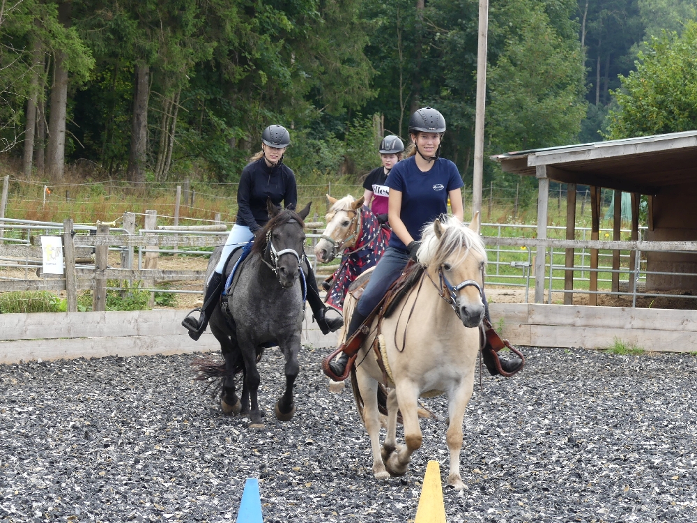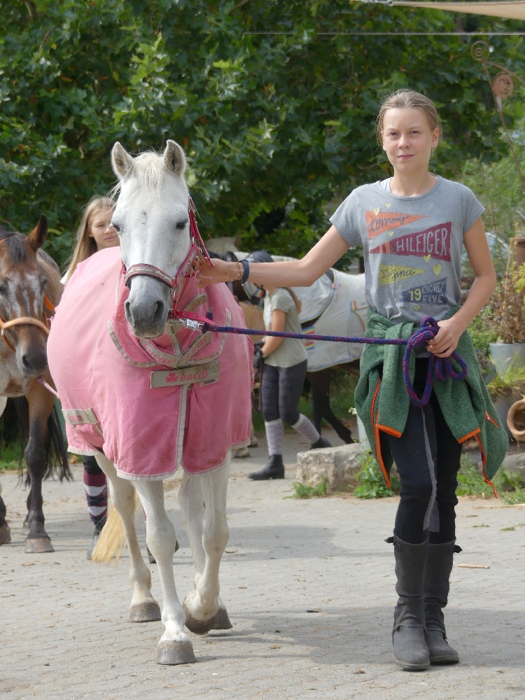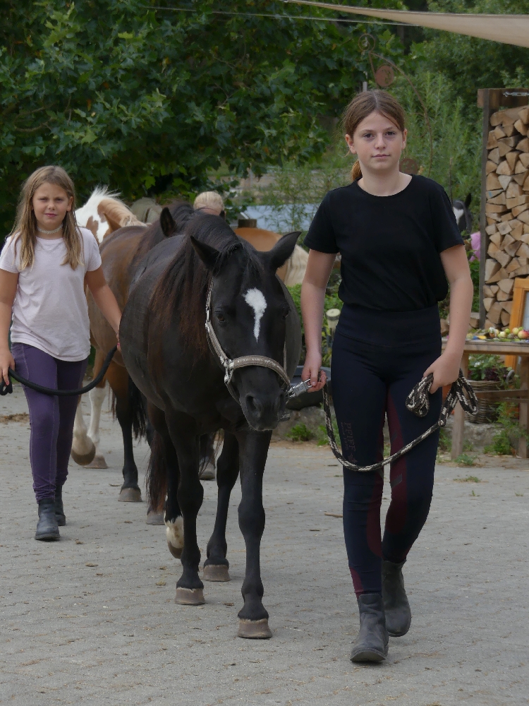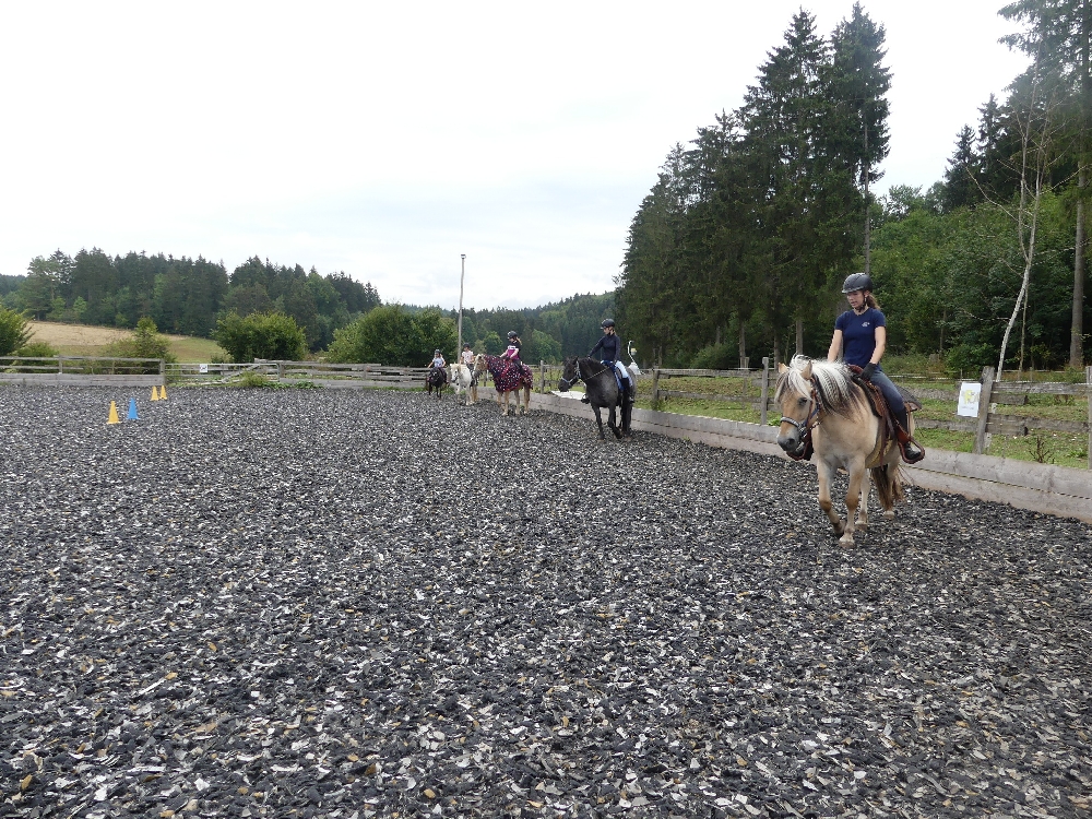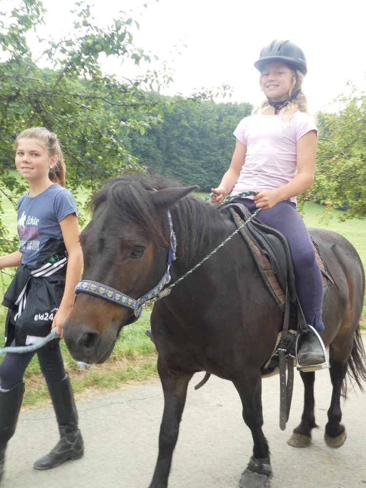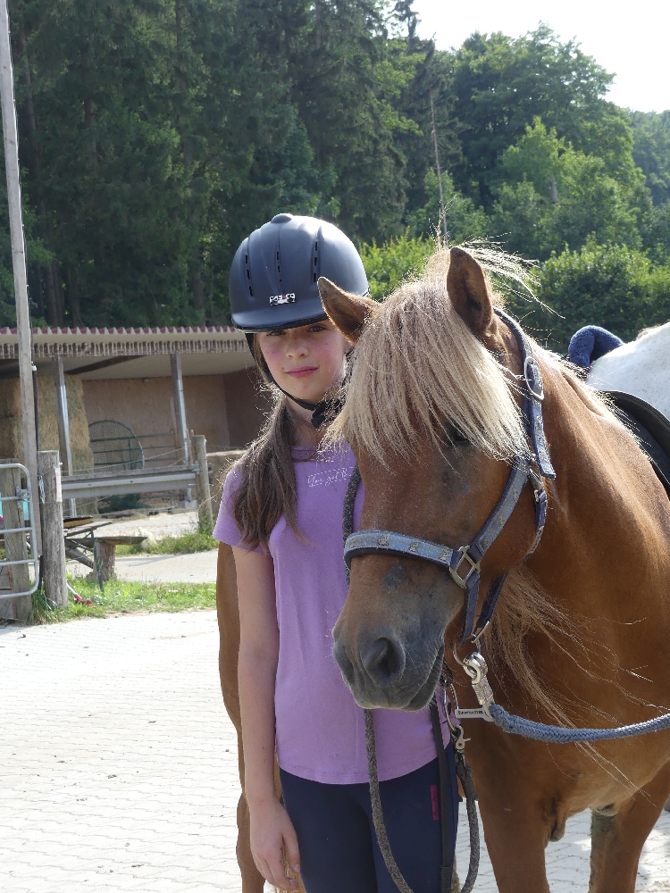 Montag, 15. August 2022: Weiter gehts mit Sommer 3! Es kamen wirklich alle pünktlich an, diese Woche sind viele neue Gesichter dabei, da gibt es wieder mal Löcher im Bauch… 😉 Nein, Scherz, es sind ja genug Betreuerinnen da und auch einige Teilnehmerinnen, die schon öfter da waren oder auch hier reiten, das wird schon klappen! Jedenfalls haben alle Kids ein Pferd bekommen, ein Bett für jeden war auch da und so konnte es losgehen! Nach der Pferde- und Zimmereinteilung mit anschließendem Hofrundgang wurden zuerst die Zimmer bezogen. Danach bekamen alle ihre Pferde für die Woche gesagt und jeder durfte sein Pferd rausholen zum ersten Kennenlernen und Putzen. Und weil die ganze Aufregung auch Hunger macht, gab es noch Mittagessen und in der Mittagspause wurde der Laden gestürmt, bevor es eeendlich zum Reiten ging. Nach und nach kamen alle in der Reithalle vorbei zur Probereitstunde und um zu schauen, ob Kind und Pferd zusammen passen. Heute Abend werden die Kleingruppen eingeteilt, in denen ab Morgen der normale Reitunterricht stattfindet. Was es als Abendprogramm geben wird? Mhm, ist etwas wetterabhängig, im Moment haben wir 1 Stunde Sonne, dann 15 Minuten Regen, dann wieder 1 Stunde Sonne usw. Naja, da wird uns was einfallen, da bin ich mir sicher!