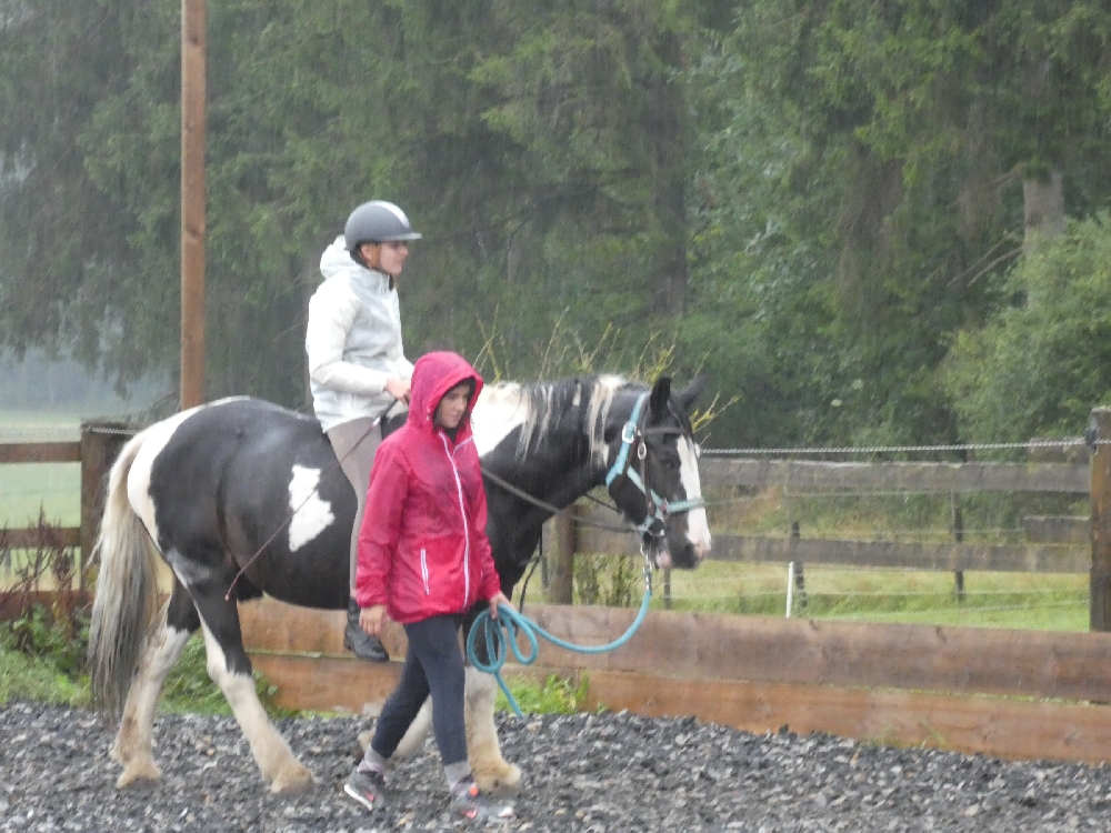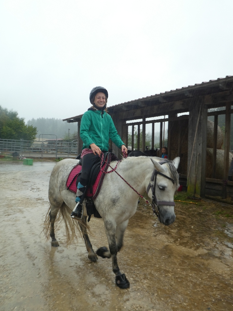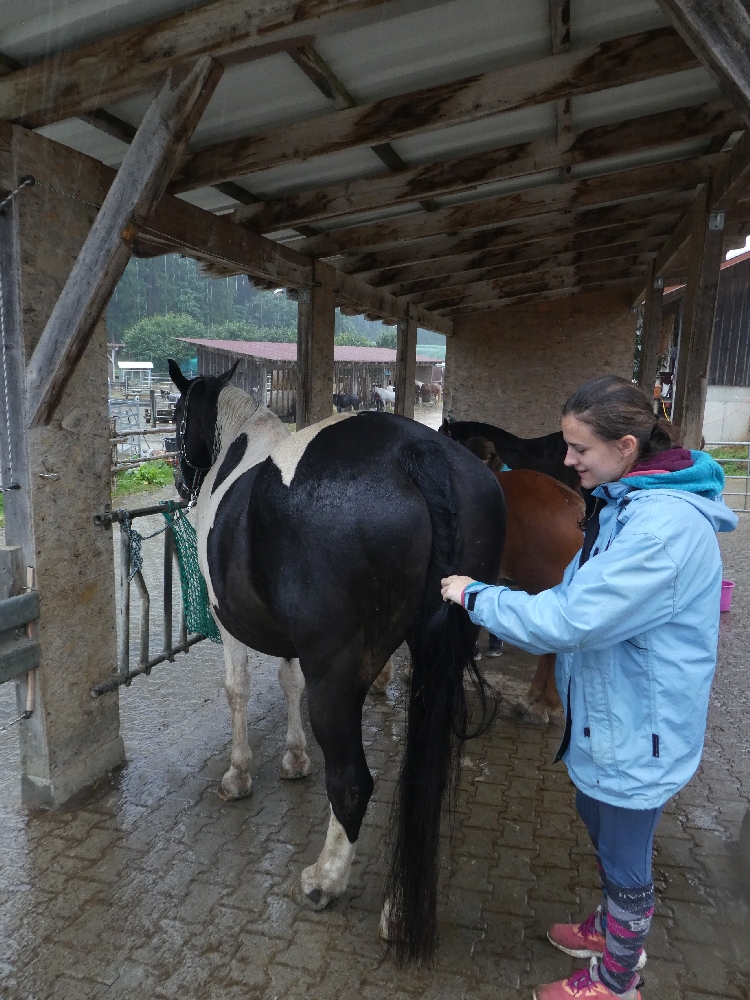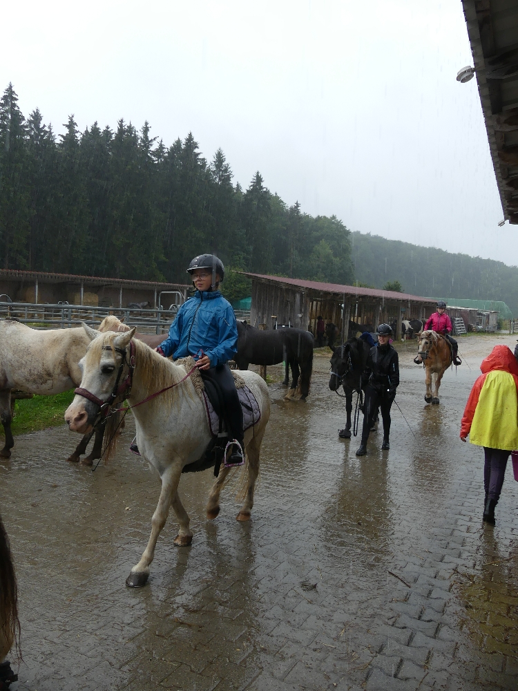 Freitag, 19. August 2022: Jetzt ist er da, der letzte Tag – und der Himmel weint! Na sagen wir mal so, es hat heute nur 1x geregnet: von morgens bis abends… Ok, wir reden es uns schön: keine Wespen und Mücken, die Pferde haben Erholungspause mit Dusche von oben, das Gras und die Bäume und Blumen brauchten es ganz dringend, also soooo schlimm war es garnicht… Leider hat das ein oder andere Kind seine Regenjacke vergessen/ nicht gefunden/ nicht dabei/ sie ist nicht dicht, sodass ein paar Mal umziehen angesagt war. Nach so einer warmen, sonnigen Woche kann das ja mal vorkommen. Trotzdem wurde natürlich geritten, aber vorher hieß es Koffer runter, Zimmer fegen, Müll runter bringen usw., was man halt so macht, wenn man wieder nach Hause fährt. Anschließend wurde gemistet und schon startete das Wunschprogramm. Es gab zur Auswahl Trailparcours, Horse Agility, reiten ohne Sattel, langer und kurzer Ausritt und alle wuselten über den Hof. Zum Mittagessen gab es blecheweise selbstgemachte Pizza und es war doch alles recht leer. Auch im Laden mussten sich alle noch mit Reiseproviant eindecken und weiter gings. Heute Nachmittag kam noch das Pferde-Wellness-Programm dazu. Schon wurde es Zeit zum Pferde aufräumen und versorgen, es gab noch eine letzte Nachtischpause und die Wochengewinner mussten noch geehrt werden und schwupps: standen die Eltern schon da! Es war eine schöne Woche, Mädels!