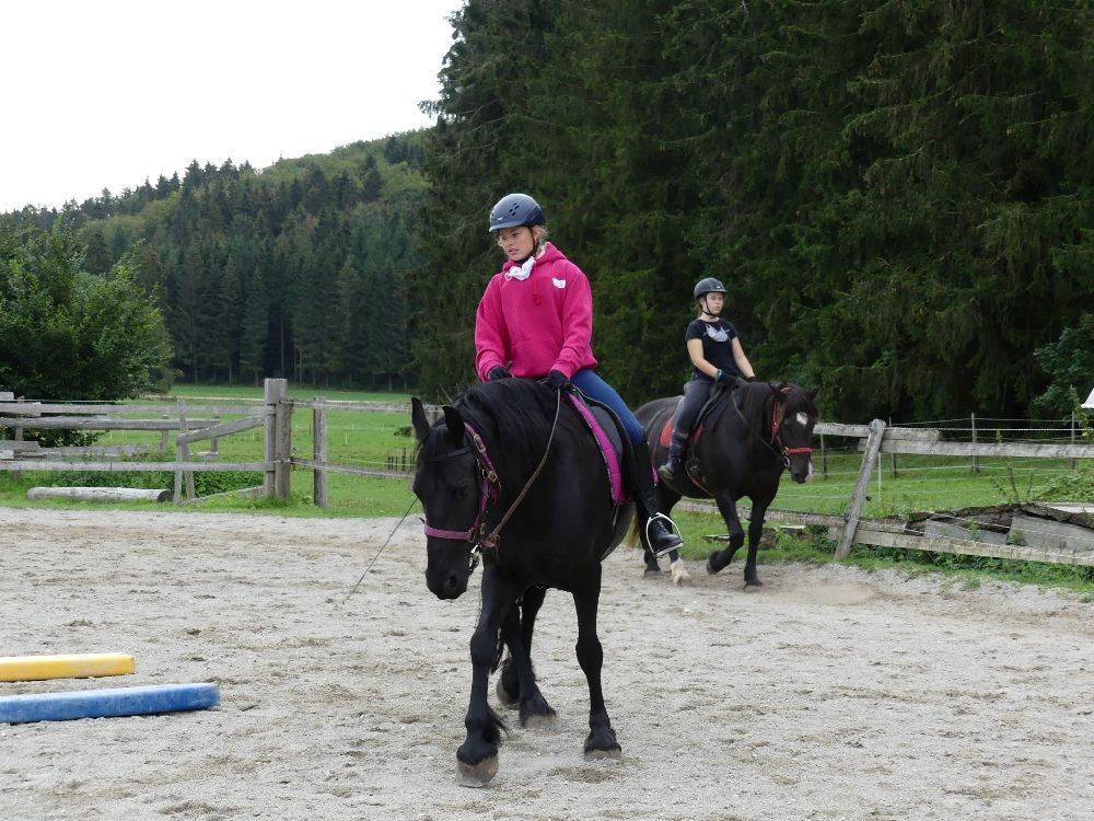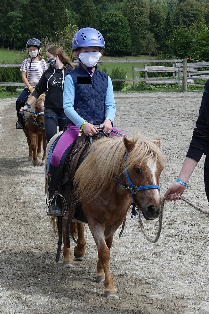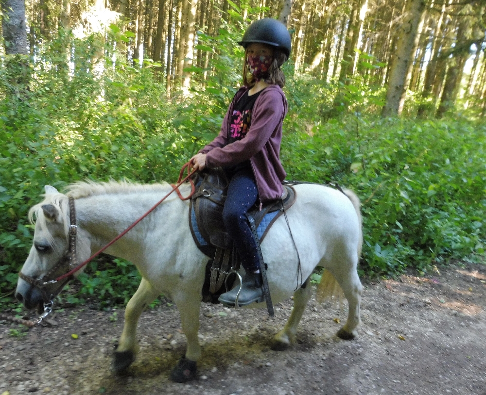 Montag, 24.08.2020: Wir haben Bergfest und starten heute in die Woche Sommer 4! Da kamen doch einige bekannte Gesichter angefahren (wenn man die Masken mal runternehmen konnte) und die zeigten den Neuen gleich wo es langgeht. Aber man muss sagen: alle waren gut drauf und das mit dem Abstand halten kriegen wir auch noch hin! Heute morgen wurden gleich nach einer Vorstellungsrunde die Pferde eingeteilt, dann gefragt, wer mit wem ins Zimmer möchte und schon gings los. Zimmer stürmen, alle in ihr „Haus“, wir haben ja 3 „Farbgruppen“, gelb, pink und türkis und danach richten sich Duschplan, Ladenplan und Wohnabteil. Anschließend gab es zum Mittagessen Spaghetti mit Tomatensoße und Salat und auch die ersten sauren Schlangen wechselten ihren Besitzer. Nach der Mittagspause holten nach und nach alle ihre Pferde aus dem Stall und kamen zur Probereitstunde. Heute Abend wird dann besprochen, wer in welche Kleingruppe kommt für den Reitunterricht ab Morgen. Das Abendprogramm stand bei Redaktionsschluss noch nicht fest……. 😉