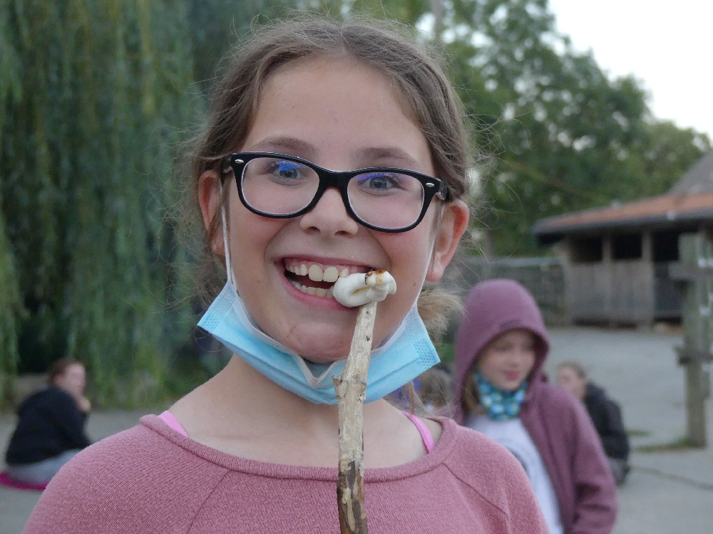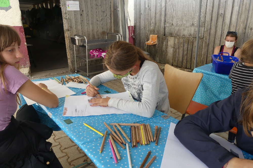 Dienstag, 25.08.2020: Grau sah es heute morgen aus aber das änderte sich und auch die Sonne ließ sich hin und wieder blicken. Die Kids hatten jede Menge zu tun, denn außer Reiten gibt es noch viele andere Dinge, die man auf einem Reiterhof so machen muss: einige Pferde bekommen jeden Tag Zusatzfutter und wollen auch gern gestriegelt werden, andere bekommen Globuli und wieder andere möchten einfach ein paar Streicheleinheiten. Das erledigten besonders die Kleineren mit Feureifer! Zum Mittagessen gab es heute leckere Rosmarinkartoffelspalten aus dem Backofen mit einem seeeehr leckeren Kräuterquark, Salat und blecheweise Nachschub! In der Mittagspause wurde der Laden gestürmt und Pferdeleckerlis, Gummischlangen und Ufos wechselten den Besitzer. Am Nachmittag gingen die Kids, die am Morgen in der Halle oder auf dem Platz waren, ausreiten und umgekehrt. Zwischendrin wurde kiloweise Stracciatella- und Erdbeer-Joghurt verspeist – neben jeder Menge Obst. Trotzdem hatten alle zum Abendessen wieder Hunger und mussten sich zum Abendprogramm stärken, denn da ging es auf eine Schnitzeljagd. In den Schatztruhen befanden sich Utensilien, um einen Traumfänger zu basteln. Da sind wir mal gespannt, was daraus wurde 🙂
