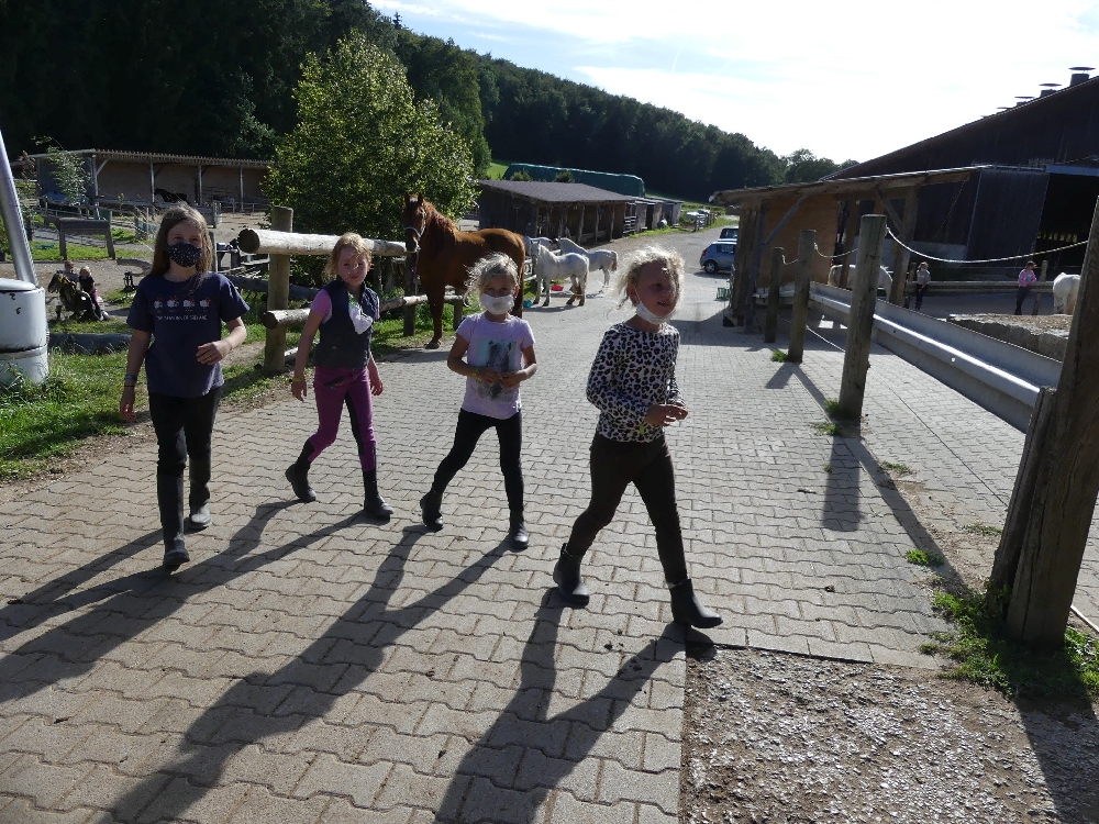 Freitag, 28.08.2020: Da isser, der letzte Tag! Sogar der Himmel musste weinen, wenigstens ließ er sich damit aber Zeit bis Mittags…. 😉 Nach der Grillparty gestern Abend waren einige doch recht müde! Aber es ging ja weiter im Programm! Zuerst mussten heute die Zimmer geräumt und die Koffer runter gebracht werden, dann ging es für alle zum Misten in den Stall. Anschließend startete das Wunschprogramm: es gab Reiten ohne Sattel, Horse Agility, kurzer Ausritt, langer Ausritt, Beautycontest, Trailparcours. Nach dem ersten Durchgang kam schon das Mittagessen an die Reihe und auch im Laden war ordentlich was los, schließlich brauchte man ja Reiseproviant. Nach und nach waren alle fertig und nach der Nachtischpause wurden noch die Gewinner der Woche geehrt und bekamen ihre Preise. Punkt 17 Uhr ging es los mit den Elterntaxis und per „A-Hörnchen an B-Hörnchen“ wurden alle Kids „angefordert“ und kamen hoch, um ihre Eltern zu begrüßen – oder ließen sich noch jeeede Menge Zeit…. 😉 Dann war es leer auf dem Hof und die Betreuer verabschiedeten sich noch von unserem FÖJ Nicole – wie schnell doch so ein Jahr vergeht!
