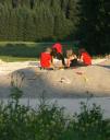 Donnerstag, 6. August 2009: Ein seeehr heißer Tag! Da kam außer dem Reiten auch das Schweife waschen recht! Das Wasser traf nämlich auch öfter mal daneben….. 😉 Es war so heiß, dass nach dem Mittagessen – Schnitzel, Pommes und Salat – alle schlapp und müde waren und es nach einstimmigem, demokratischen Beschluß und großem Hallo eine Siesta gab bis 16.25 Uhr! Dadurch verzögerte sich natürlich auch der letzte Ausritt, so daß es schon leicht dämmrig war, bis alle zurück waren. Das tat aber der guten Stimmung keinen Abbruch: die einen gingen misten und (freiwillig!!!) putzen, die anderen sammelten Pferdeäpfel und der Rest stürmte den Sandhaufen. So war für jeden was dabei und nach dem Abendessen wirds vielleicht noch für ein Reitzeit – Kino im Reiterstüble reichen!