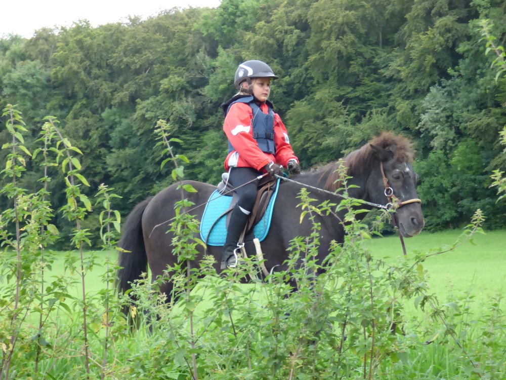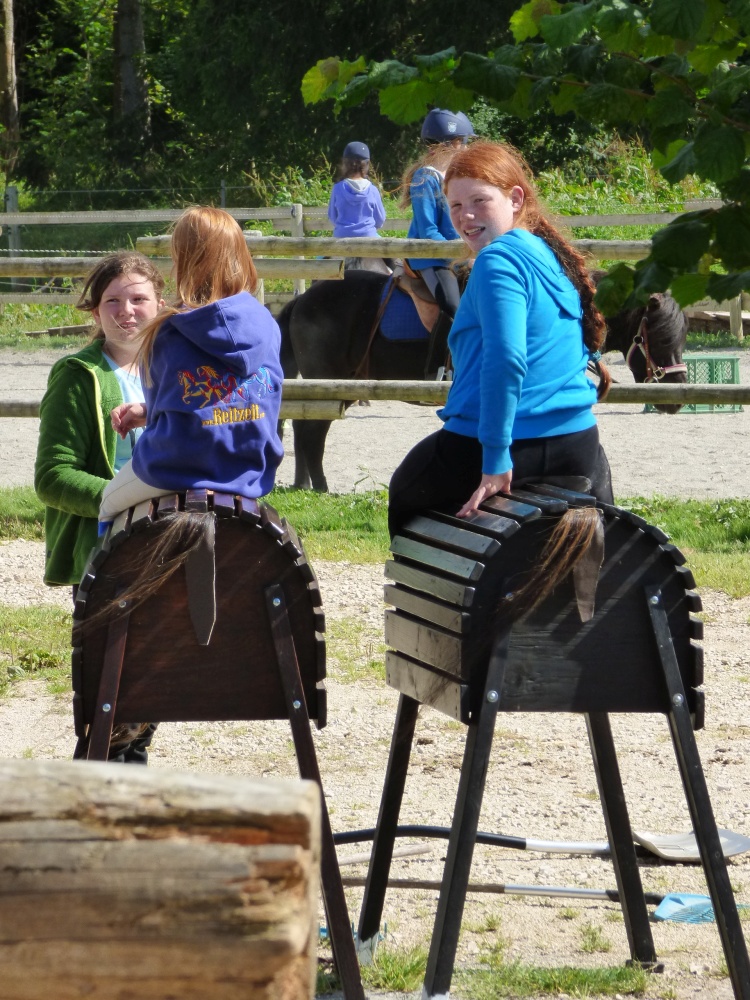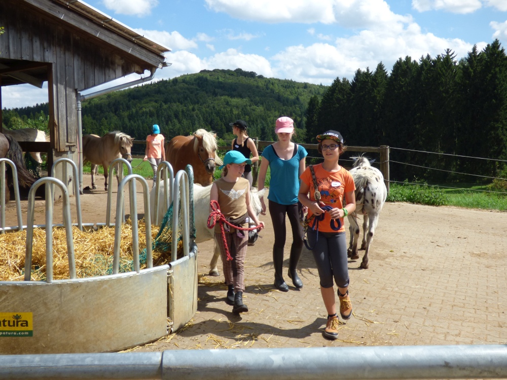 Dienstag, 9. August 2016: Leider konnte nicht ermittelt werden, wer gestern seinen Teller nicht leer gegessen hat: heute morgen empfing uns der Tag kalt und regnerisch! Aaaber die Wettervorhersage hat sich mal wieder geirrt, denn am Nachmittag kam sogar die Sonne wieder. Also ran an die Pferde und los gings mit dem Tagesprogramm. Es wurde gemistet, gefegt, die Putzkisten sortiert, ältere Pferde geputzt und natürlich auch geritten. So langsam tauen alle auf und überall hörte man es heute kichern, quieken und rufen. Auch der Spielplatz war ein gern gesehener Ort heute. Zum MIttagessen gab es Currywurstpfanne und alle holten sich volle Teller ab. Einige hatten den Plan, in der MIttagspause ein Nickerchen zu machen, ob es da wohl noch ein Mitternachtschwätzchen gab? Nach der MIttagpause – und ein paar Brausebällen und UFOs im Laden – lief das Nachmittagsprogramm an. Als Nachtisch gab es heute oberleckeren Schoko- und Vanillepudding und es waren am Ende fast 10 kg verputzt…. 😉 Jaja, die viiiiele frische Luft….. 😉 Was es heute Abend noch gibt für die wilde Bande stand noch nicht fest. Ich glaube, soooviel wollen sie nicht mehr machen, die Betten rufen…..