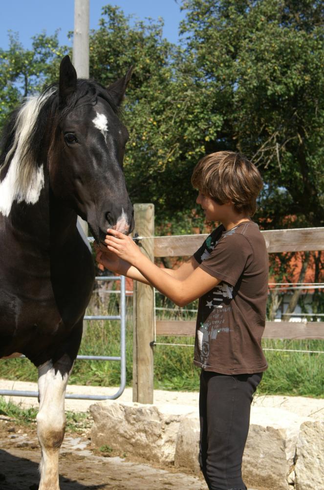 Montag, 24. August 2009: Die letzte Sommer – Reiterferienwoche hat begonnen! Pünktlich wie die Maurer standen die ersten aufgeregten ReiterInnen vor der Tür und ruckzuck war die Gruppe vollständig. Es gab ein großes Hallo und Wiedersehensfreude bei vielen, die sich aus den letzten Jahren kennen und sich jedes Jahr hier treffen. Und in dieser Woche sind auch die Reitzeit – Reitschüler stark vertreten, also nochmal großes Hallo! Nach der Vorstellungsrunde und Zimmerverteilung stiefelten die Übernachtungskinder los zum Betten beziehen, die Tageskinder konnten sich auch umziehen, bevor die Pferde verteilt und schonmal auf der Koppel besucht wurden. Anschließend leckeres Mittagessen und Mittagspause und dann aber…… Die erste Gruppe war pünktlich in der Halle und startete zur Sichtungsrunde. Schlag auf Schlag gings und bis ca. 18 Uhr waren alle dran mit Reitstunde. Zwischendrin Nachtischpause mit Kuchen, gemeinsames misten im Stall und schon war Abendessenszeit. Ein paar Kids duschten vorher, ein paar nachher und im Moment machen sie die Hofrallye und es gibt hoffentlich nur Sieger!