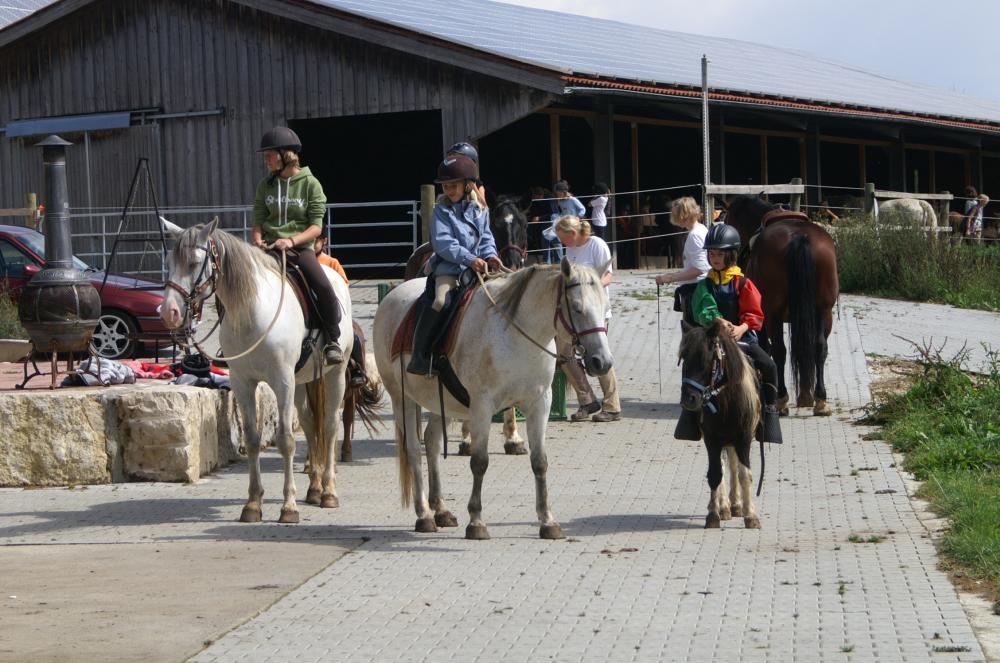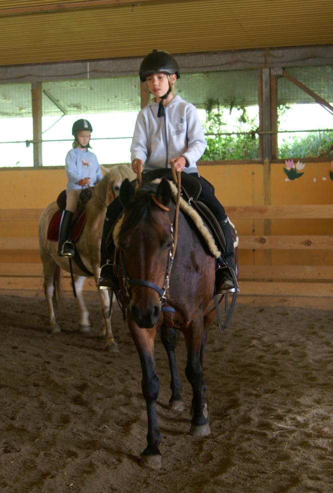 Dienstag, 25. August 2009: So wie der Tag heut angefangen hat – Blitz, Donner, Wolkenbruch – so endete er auch heut Abend! Fast pünktlich zur Abholung der tageskinder gings rund, nachdem es den ganzen Tag warm und sonnig war. Naja, so hats wieder eine Abkühlung für die Nacht und hoffentlich ab Morgen prima Wetter, denn Morgen ist Lagerfeuerabend geplant. Heut gabs erstmal wieder jede Menge zu tun! Morgens gingen schon 3 Gruppen ausreiten, die restlichen beiden Gruppen ritten in der Halle. Zwischendrin wurde am Holzpferd geübt: Entlastungssitz, Beinhaltung etc. Nach dem Mittagessen und der Mittagspause ging es weiter mit dem Programm: jetzt gingen auch die beiden letzten Gruppen ausreiten und die anderen hatten Reitstunde auf dem Platz und in der Reithalle. Dazwischen: Sattelpflege, Knoten üben, Mit-Knoten-anbinden-Schnelligkeitswettbewerb und natürlich Nachtischpause! Was auch nicht fehlen durfte war das Misten. Das Abendprogramm, das wird eine Überraschung – für Alle……… Gruß an Steffi von dieser Stelle aus! 😉